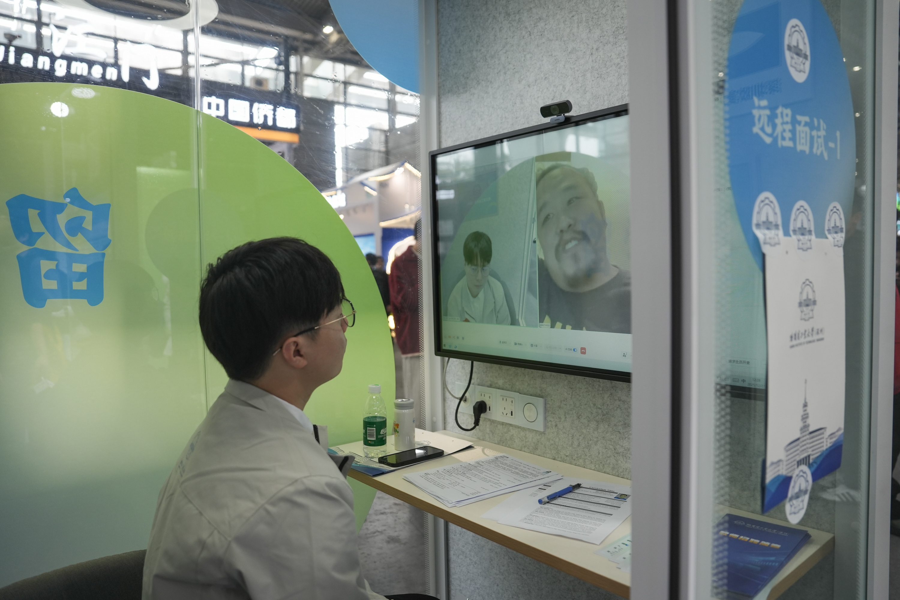 为破解时空阻隔难题,会场特别设置4个线上面试舱,实现全球海外学子与广汽、广东电网等30家重点企业的实时云端对接,让海外学子无需远渡重洋,就能精准链接大湾区的优质就业资源。