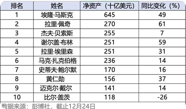 此外,据彭博社统计显示,截至2025年圣诞节前夕美股收盘,在AI芯片巨头英伟达市值突破4万亿美元的带动下,其创始人黄仁勋以1560亿美元净资产位列全球富豪榜第八。